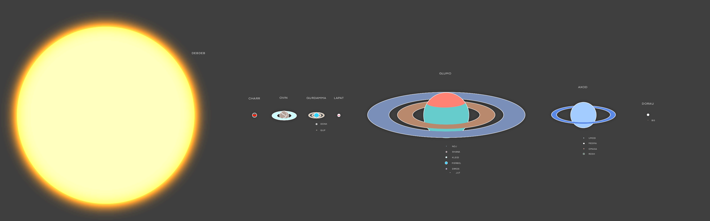 Centered within a vast protoplanetary disk, the Debdeb System is a young star system only a few light-years from Kerbol. Debdeb's planets are a glimpse of a distant past: there's Charr, a fiery, iron-bound ancestor of Moho; Gurdamma, a cratered oasis teeming with the ingredients for life; Ovin, a superheavy wasteland with gorgeous rings; and much, much more.