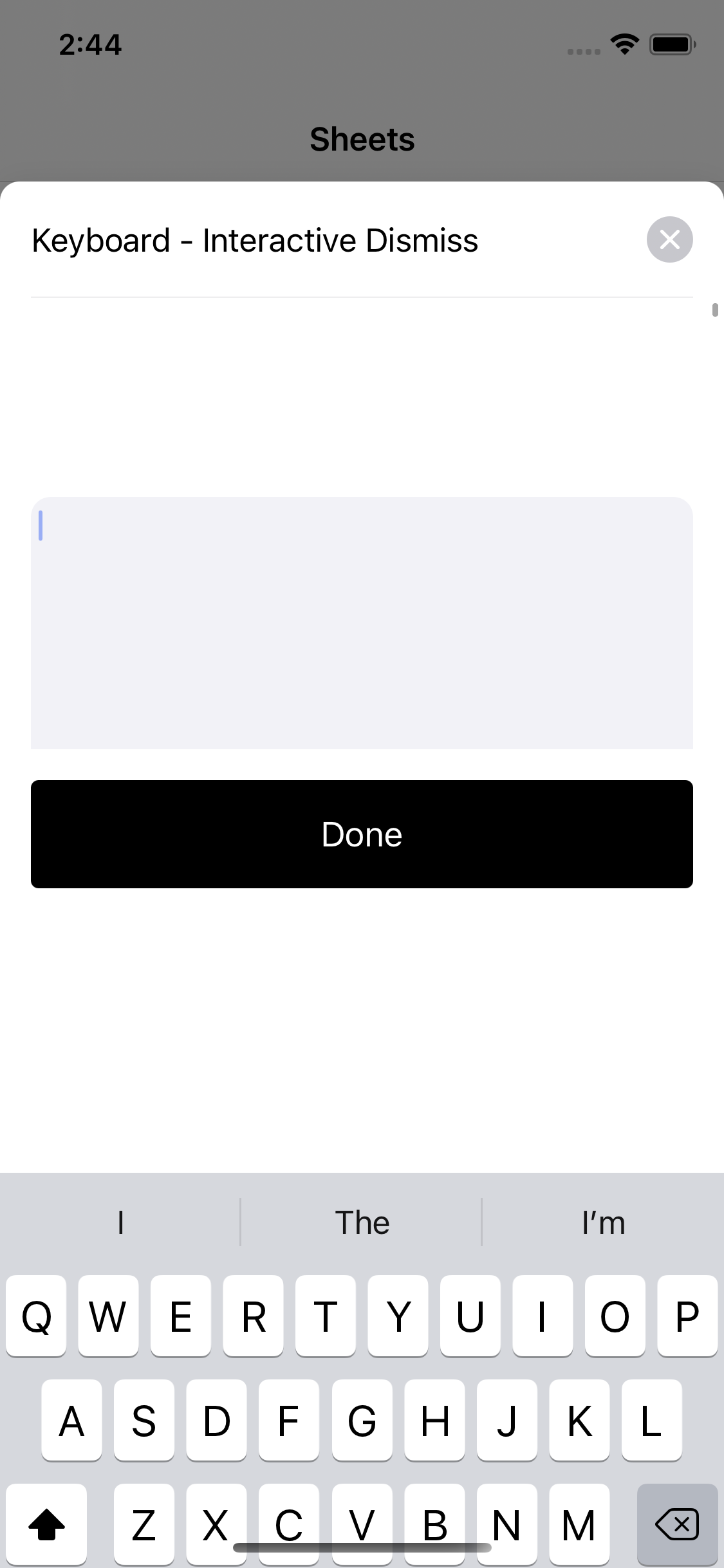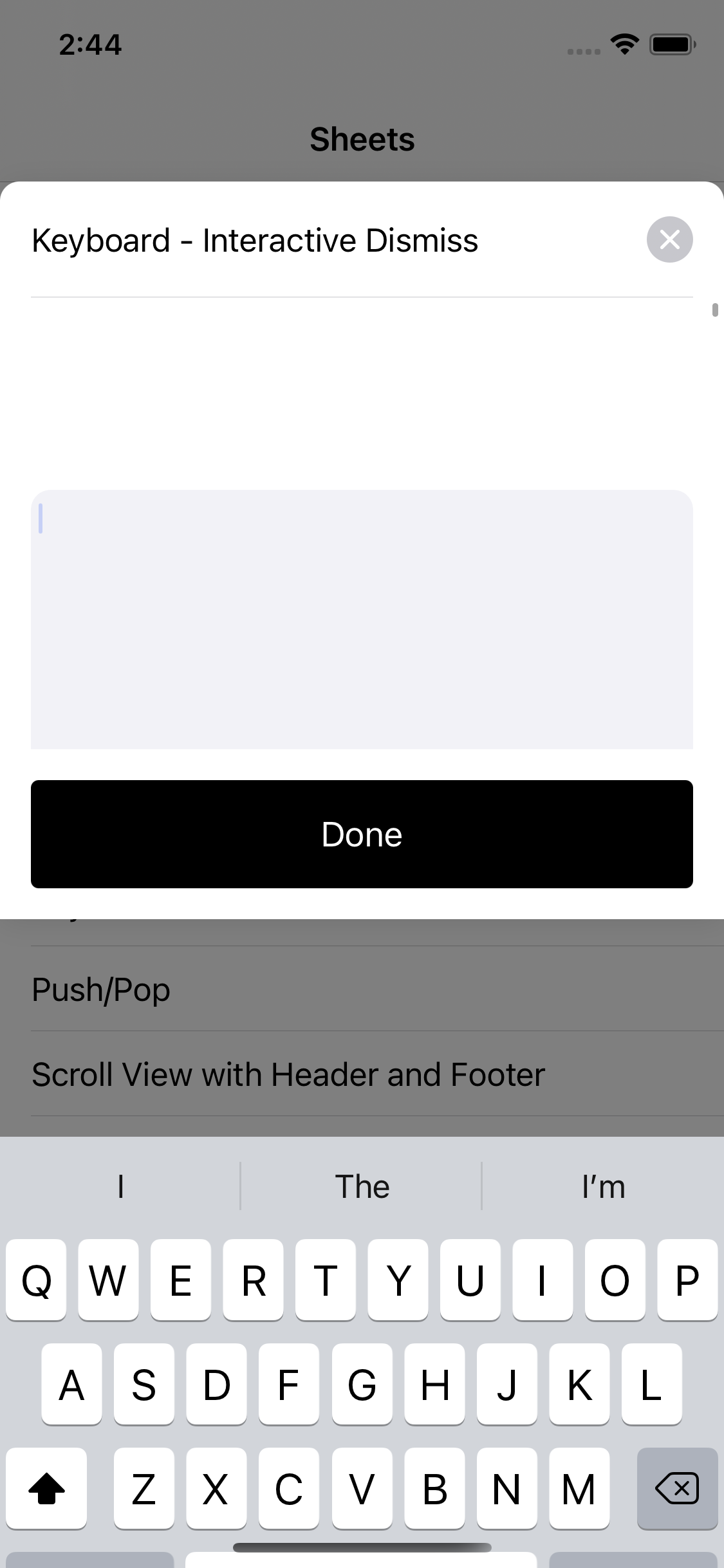SheetConfigurationthat allows a developer to setup a background color that appears behind the keyboard when the sheet is presented in the.fittingSizestyle and the keyboard is present. This prevents the view behind theSheetViewfrom peeking through when dismissing the keyboard. See the screenshots below to see an example of both using and not using this new property and dismissing the keyboard.The new example titled "Keyboard - Interactive Dismiss" uses this new feature.