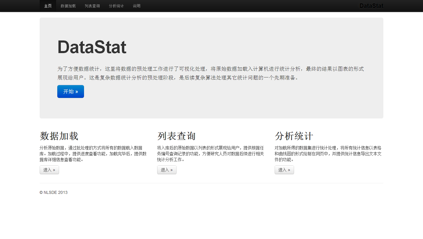 #目的 为了方便数据统计,这里将数据的预处理工作进行了可视化处理,将原始数据加载入计算机进行统计分析,最终的结果以图表的形式展现给用户。这是复杂数据统计分析的预处理阶段,是后续复杂算法处理其它统计问题的一个先期准备。 #运行 运行java -jar DataStat.jar即可启动程序,web和bootstrap目录必须与DataStat.jar处于同一目录下。 #运行 首页 控制页面 原始数据 分析图表