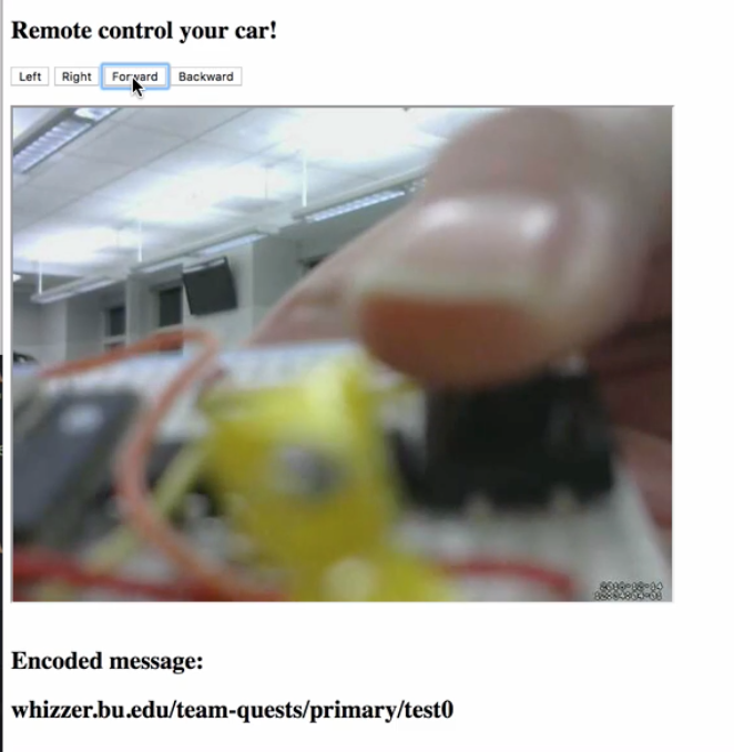 First, the remote control webpage was hosted on laptop with node.js. The page consists of 4 buttons, a video, and text revealing decoded message. Each button is bound with a unique 'click' event listener - it sends a POST request to node server (http://remotecontrol.ddns.net:1111/) with a json object with value of '0', '1', '2', and '3' representing forward, right, backward, and left directions respectively. Although Ajax module supports direct HTTP requests to HTTPD server on esp32, we ended up using XMLHttpRequest to post to node server which then sends requests to esp because we ran into CORS (Cross-Origins Resource Sharing) problems with Ajax. Therefore, node server sends a POST request which triggers car to move in the corresponding direction for 200ms. The integration of webcam is simple - it was done by simply setting the src attribute of video element on page to the ip address of pi plus port 8081. Obviously the webcam has to be started through ssh-ing into pi and enter prompt 'sudo service motion start'.