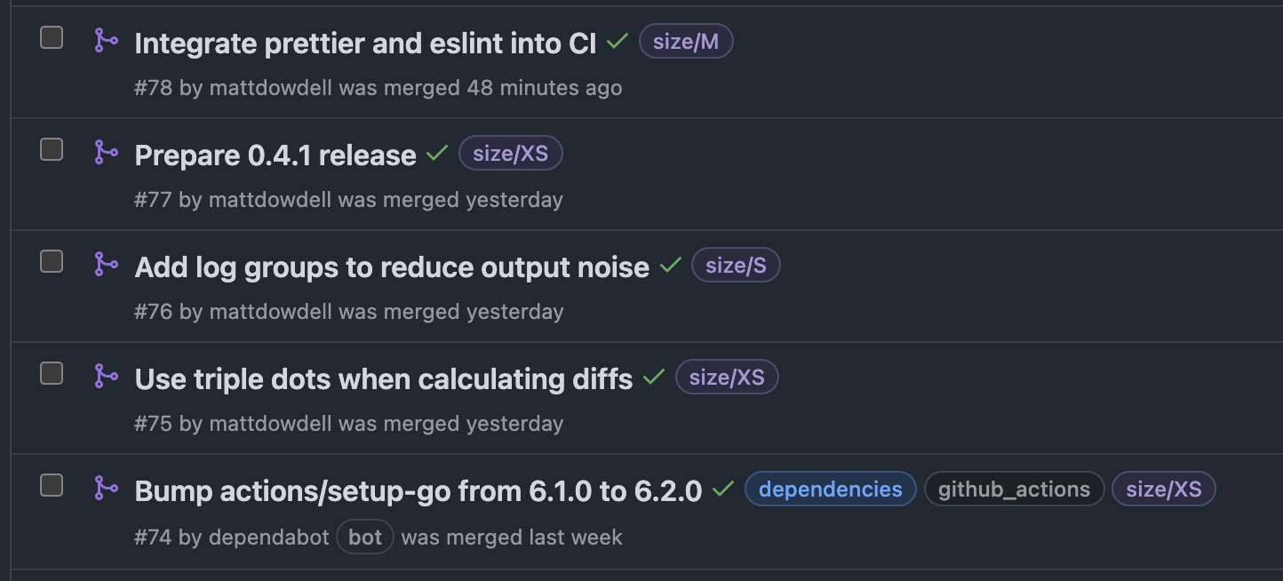 Each pull request is assigned a label that identifies its size. The thresholds for the sizes and the names of the labels can be customised using the action inputs.
