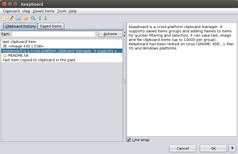 It supports text, image and file clipboard items and stores all data locally (does not require any network access nor disk access apart from its snap-confined directory). Keepboard has been tested on Linux (GNOME, KDE...), Mac OS and Windows platforms.
