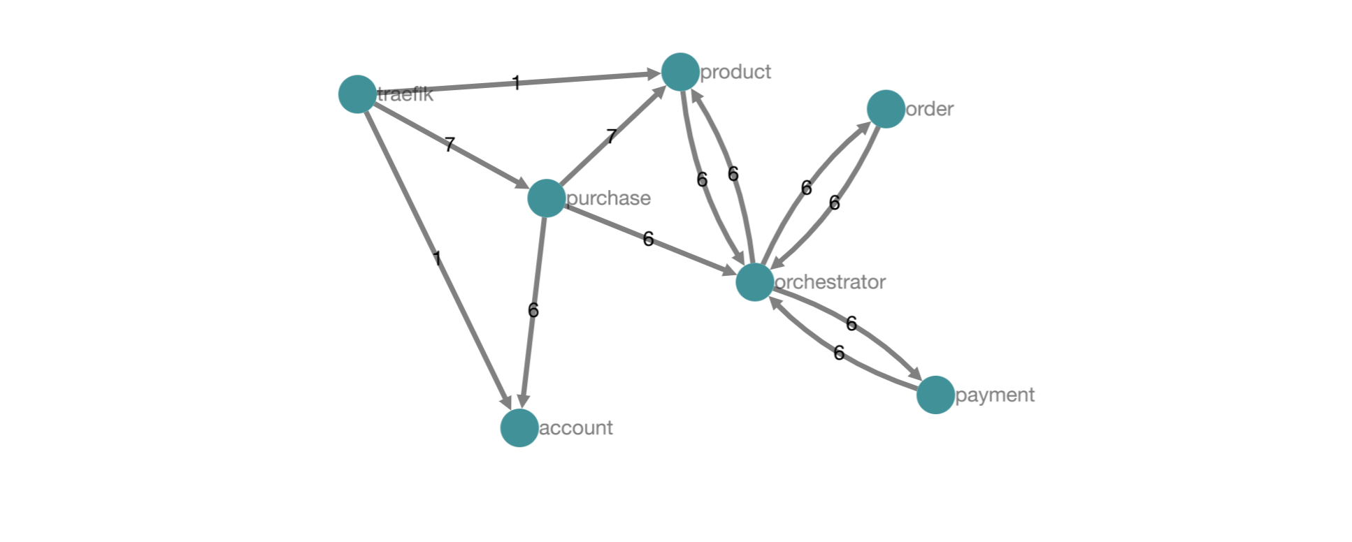 In addition, Jaeger will create service topologies for our spans. The following figure shows the topology when a client creates a new purchase.