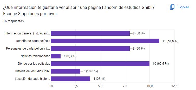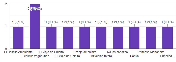 Se consultó a través del formulario cuál era la primera película en la que pensaban al mencionar los estudios Ghibli . Las respuestas recopiladas se utilizaron para posteriormente filtrar la data y desplegar la imagen del Poster promocional de las 5 películas más nombradas junto a su descripción.