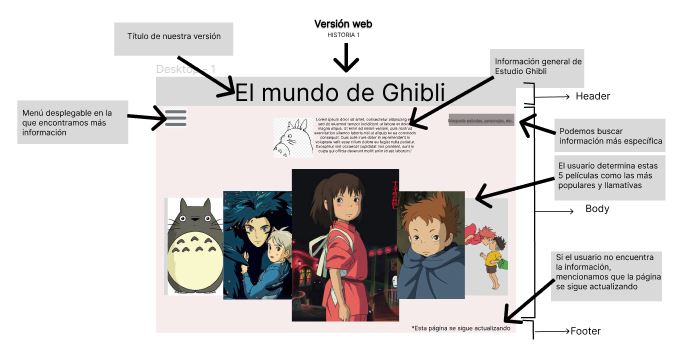 En l apágina principal podemos encontrar una pequeña descripción de lo que es el mundo de Ghibli y nuestra primera historia de usuario, que es mostrar las películas más vistas o en su mayor popularidad de la audiencia con una breve descripción, en la parte lateral izquierda vemos un conjunto de botones en la que nos lleva a la parte de pelíuclas en general, noticias y personajes de películas.