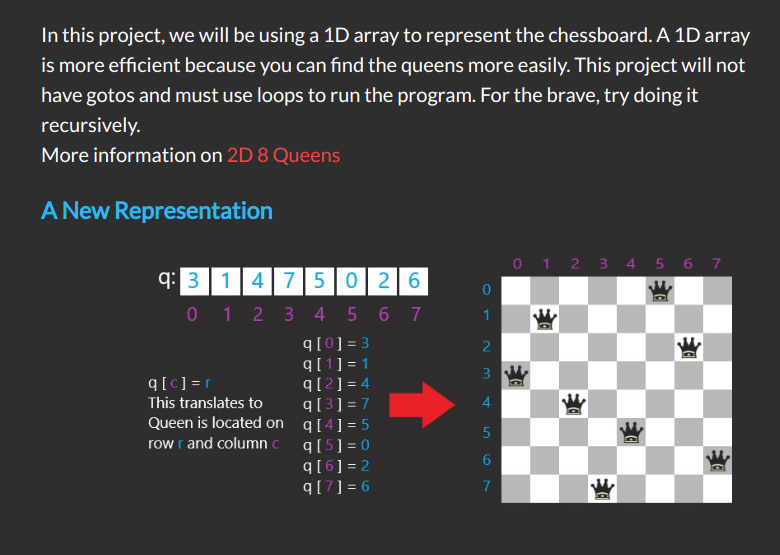 Redo the 2D 8 queens problems using a 1D array instead of a 2D array.