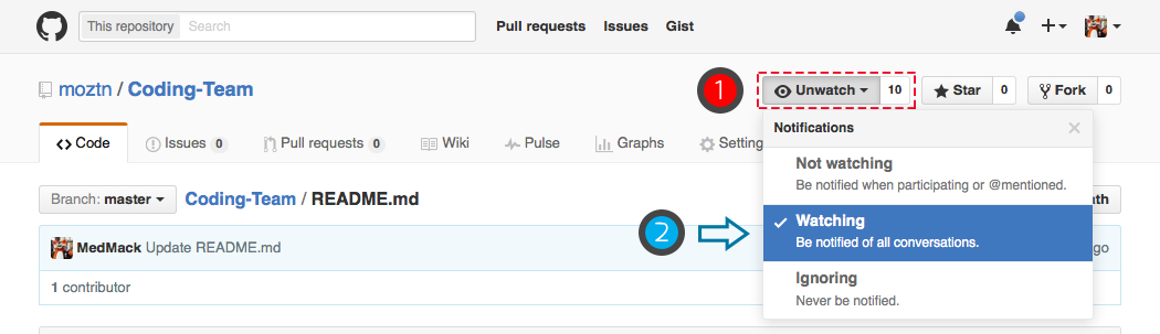 - Step 1 : Choose your team ! We have four working teams in our community where you might find your contribution area, check them out for more infomation : The coding team - The localizing team - The education team - The speaking team. Just make sure you're "watching" the repository of your team (see image below)