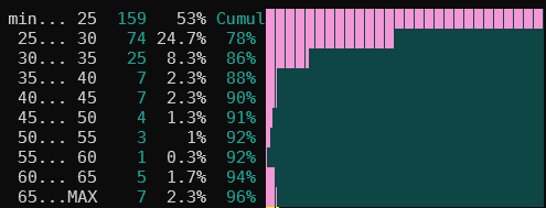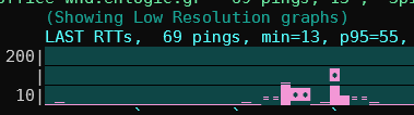 The RTT HISTOGRAM includes the most recent few hundred pings. If you don't know what a histogram is take a look at wikipedia, it's a very interesting way of representing a group of measurements. In any case you will need some experience with this graph to get a feeling of what is normal and what is not but I think it worths the time spent. Take a look at the examples below for a quick start.
