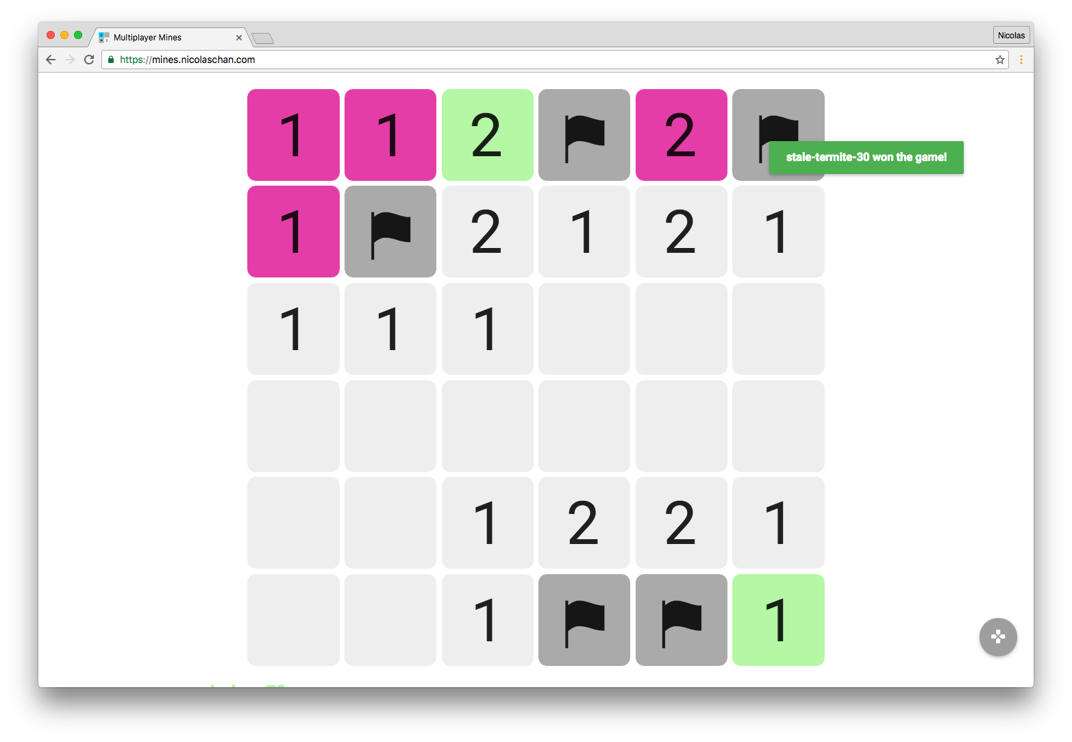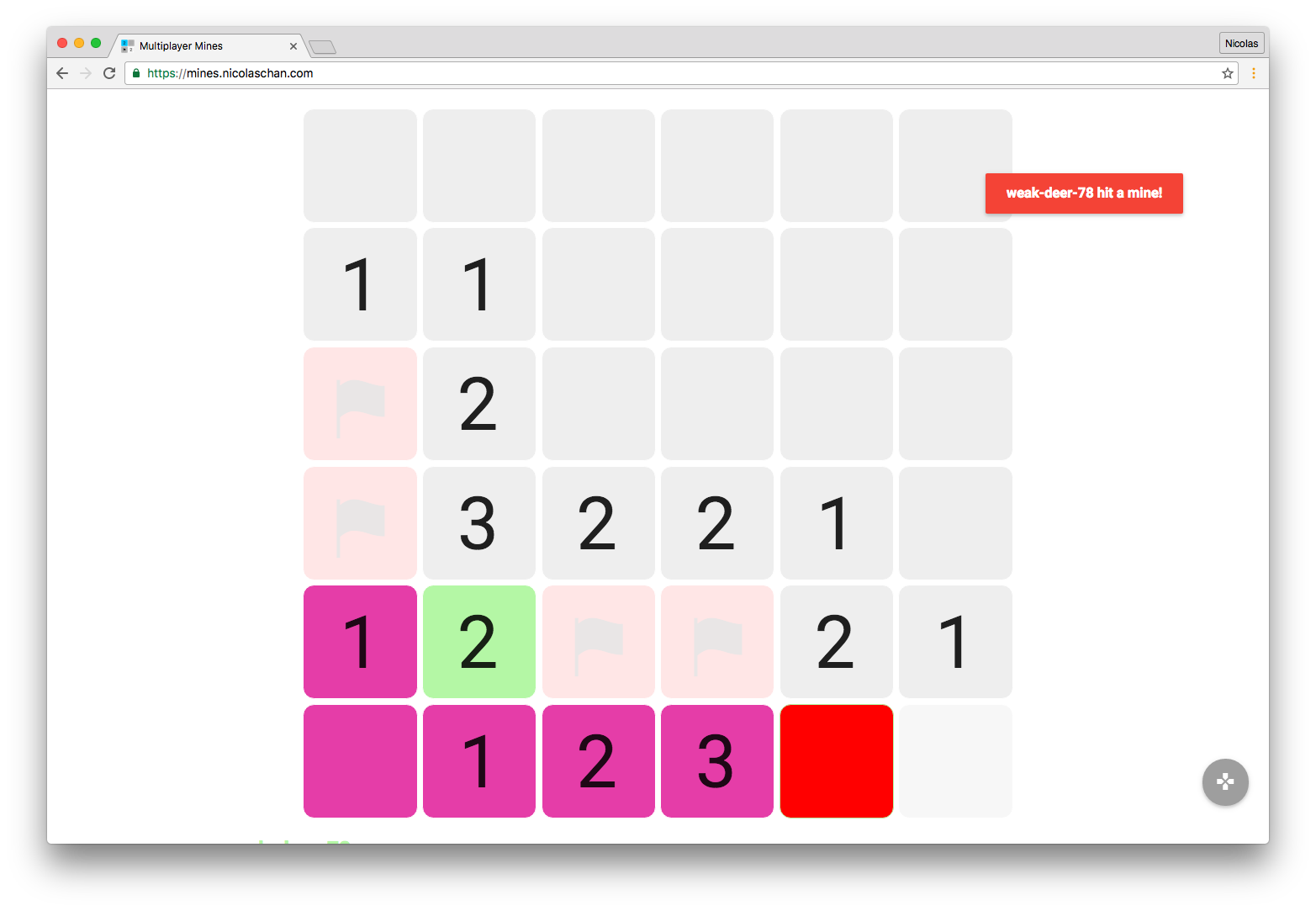 Multiplayer minesweeper in your web browser. The author hosts the game at mines.nicolaschan.com (not always available).