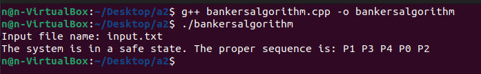 - g++ bankersalgorithm.cpp -o bankersalgorithm