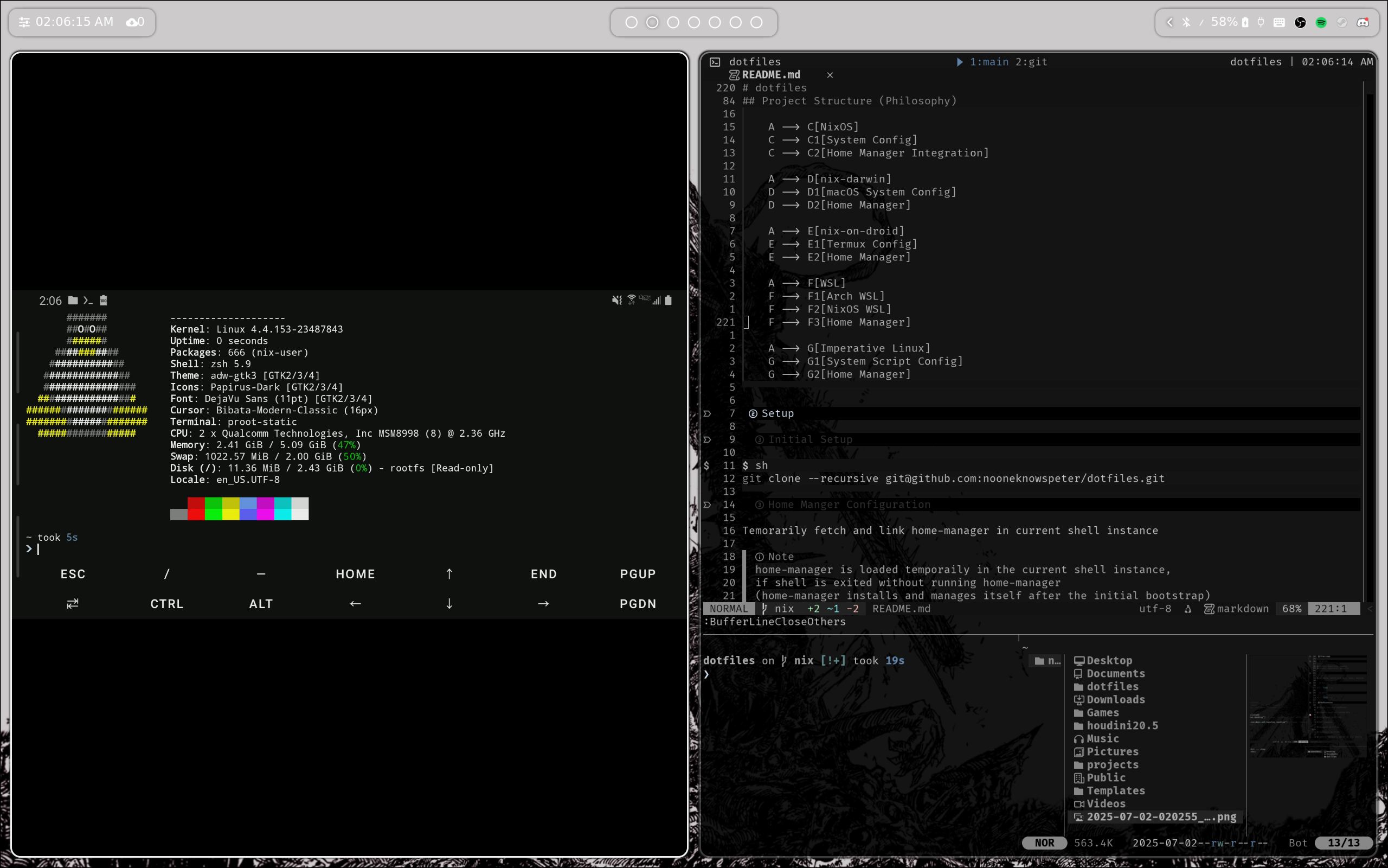 sudo ./scripts/init-arch.shnix-on-droid switch --flake /path/to/flake.nix#configNameMy essentials packages can be found here and raw dot configs here, but a quick overview on my daily driver: