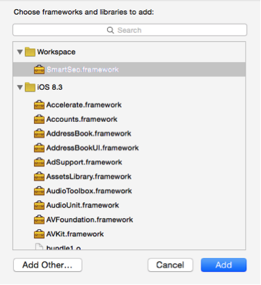 - Navigate to Build phases -> Link binary With libraries and add the SmartSec.framework from the WorkSpace group