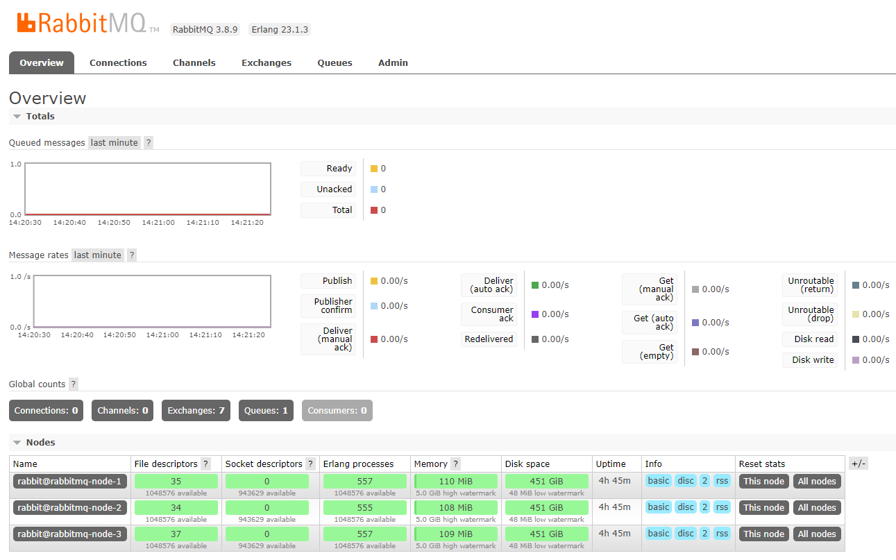 $ docker exec -ti rabbitmq-node-1 bash -c "rabbitmqctl cluster_status"RabbitMQ: http://localhost:15672/