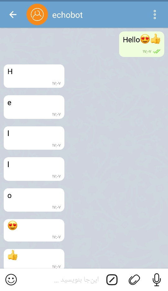 bot.run()Place your token in above example and save it in a file named echobot.py, then run below command and send text message to your bot: