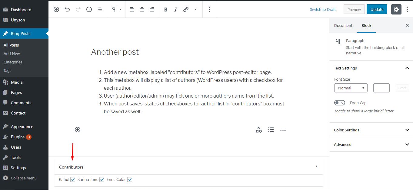 - Activate wp-posts-contributors through the 'Plugins' menu in WordPress.