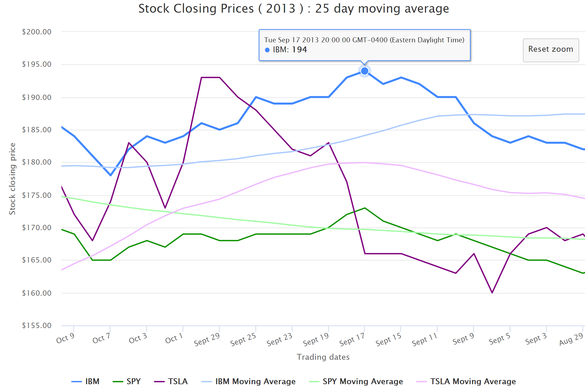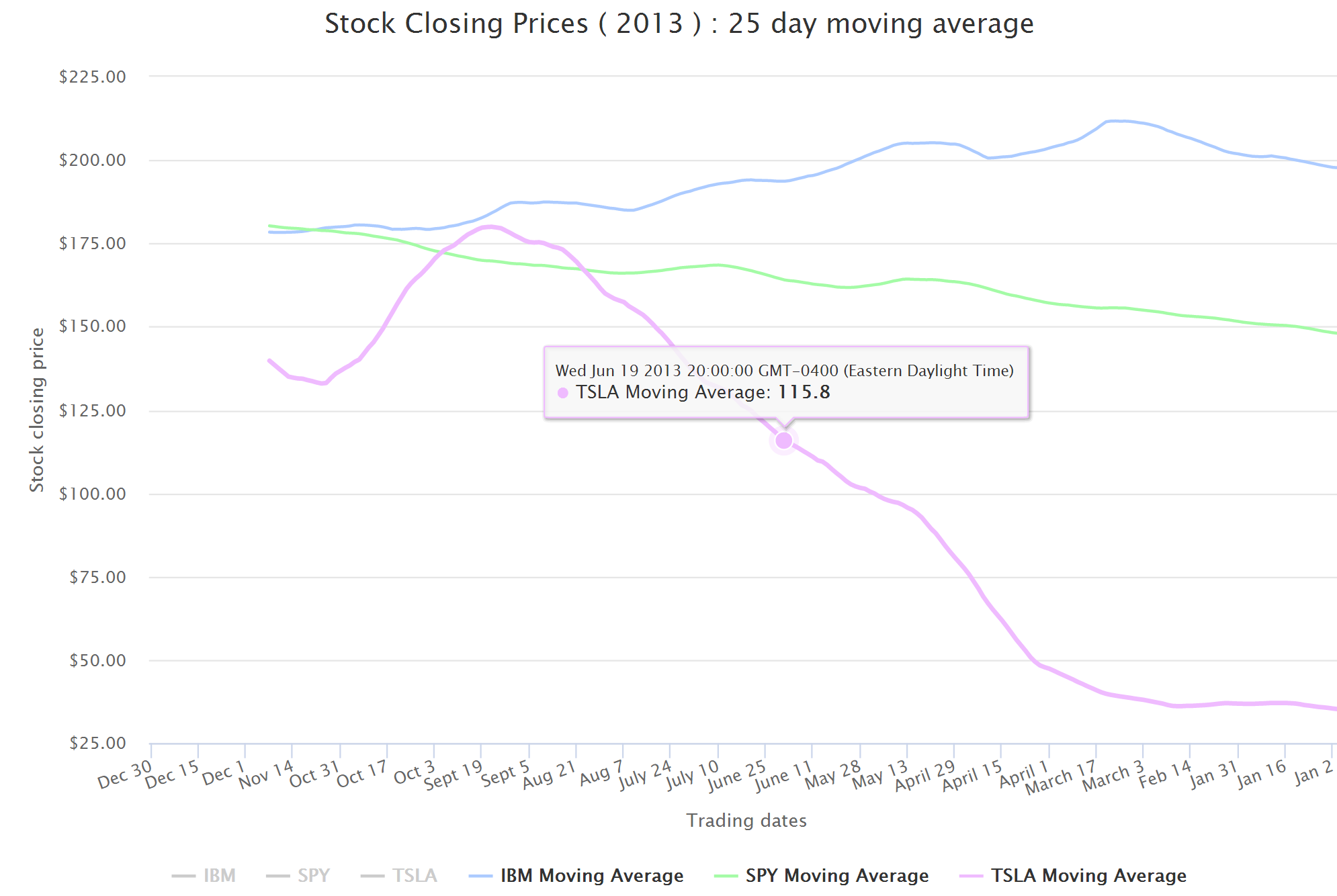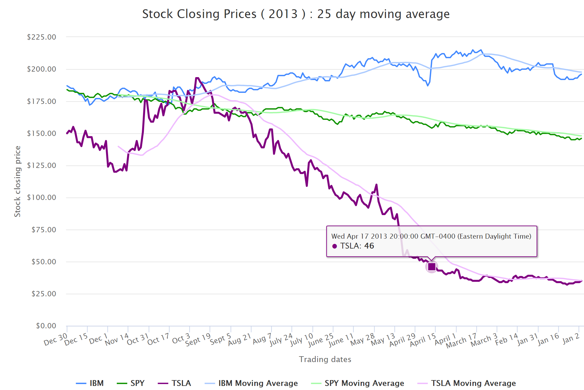 },- toggle the various series by clicking on the legends HighCharts does not include any regression on averages in its charting library, you need to use the stock charts for that type of funcitonality. We can manually calculate the moving average and add it to the charting surface as a seperate series.