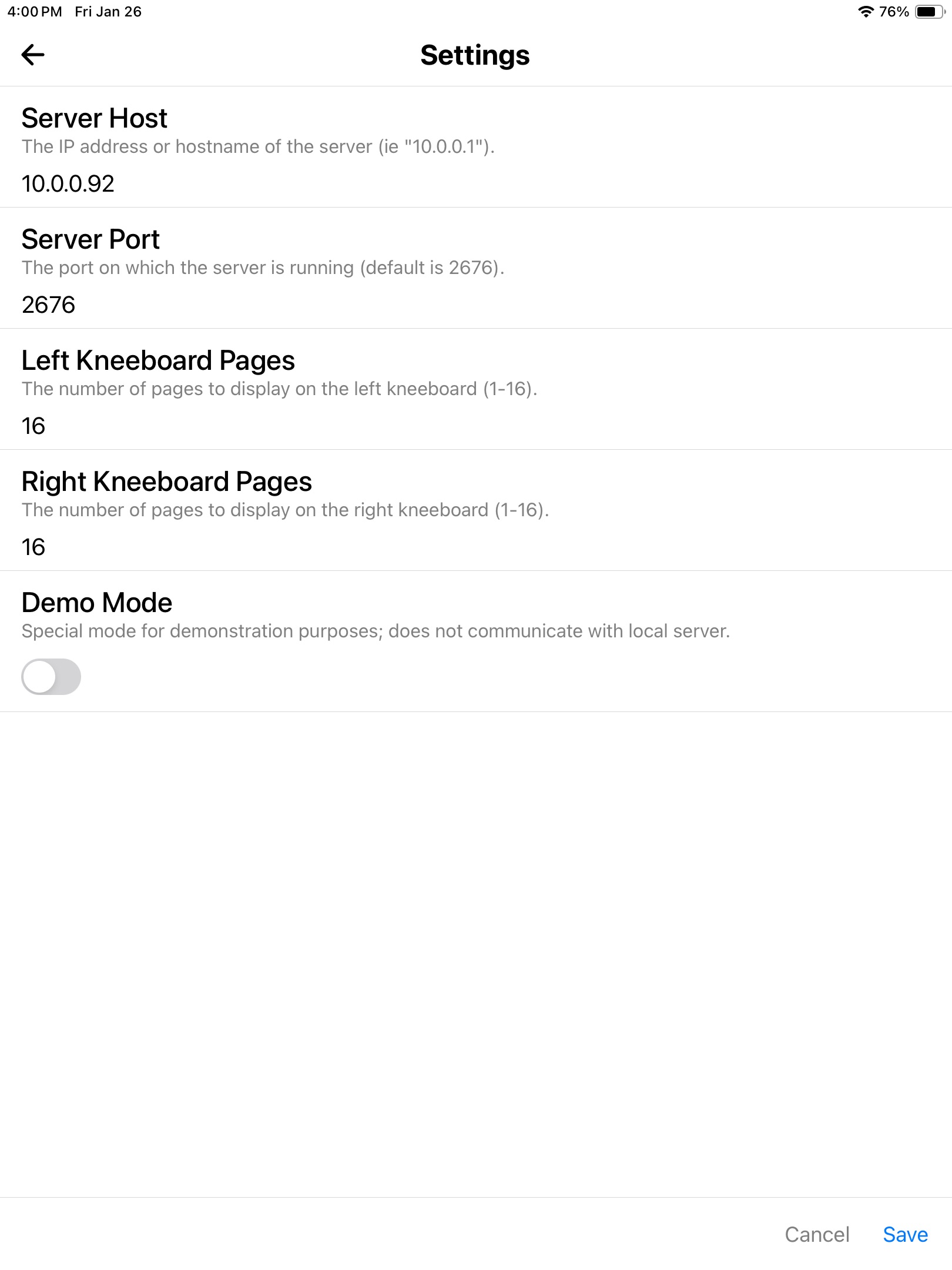 Once the server is running, you'll need to configure the relevant settings in the mobile app. Click the gear icon on the top right of the screen and enter the IP and port of the server. The IP will obviously be the address of the machine on which the server is running. Of course you'll need to make sure that your mobile device is able to route to the server.