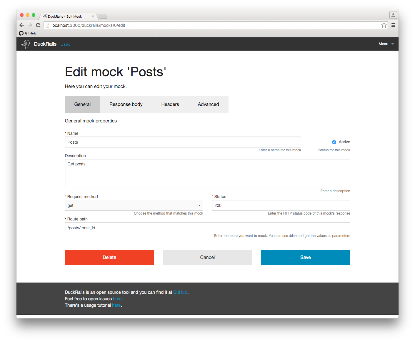 Upon save the route becomes available to the application and you can use the endpoint: