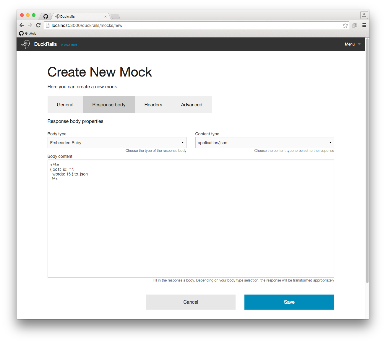 The application allows creating new routes dynamically to which developers can assign static or dynamic responses:
