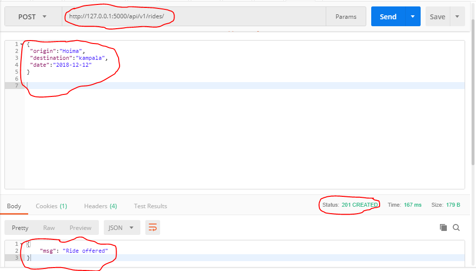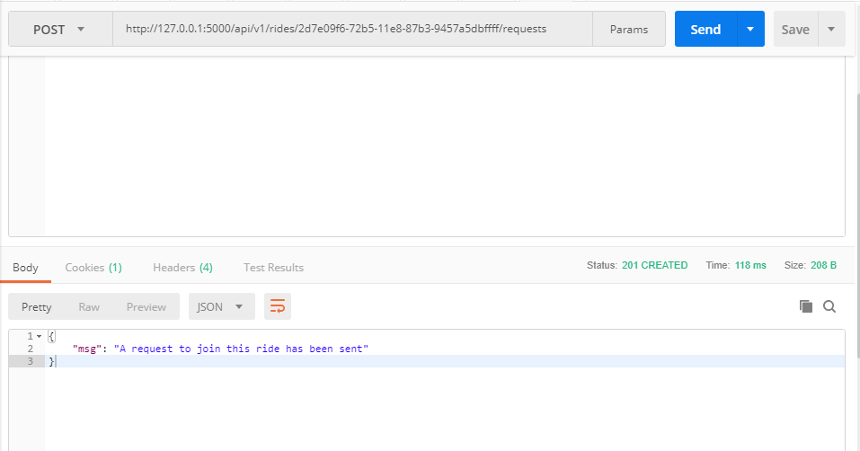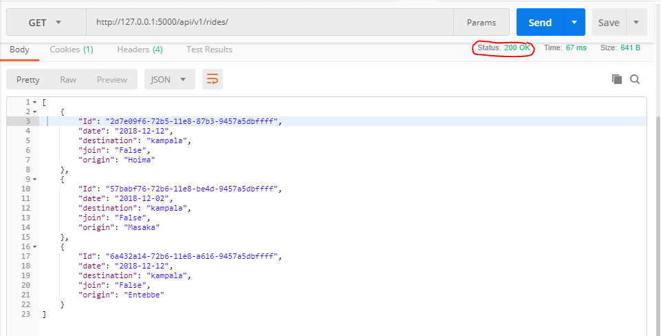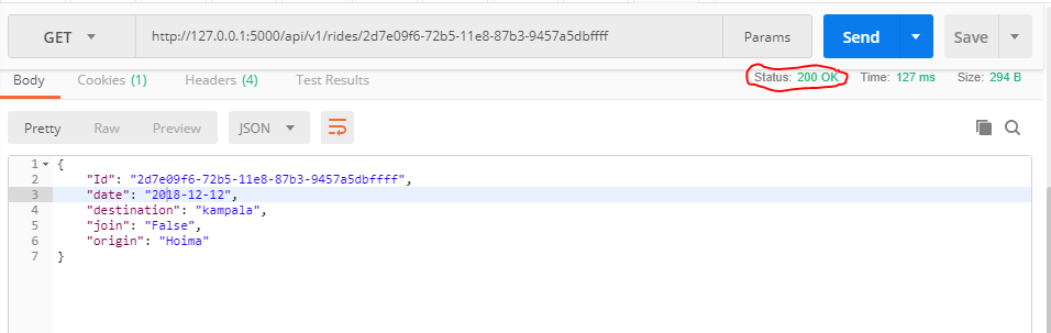 - Open postman and navigate to http://127.0.0.1:5000/api/v1/rides/