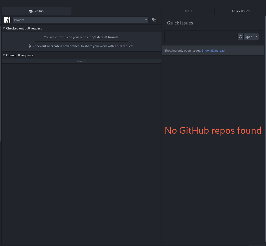 When using your extension I get 'No GitHub repos found' but the GitHub extension works fine. I also have made a new personal access token with no change. I'll be leaving this alone for a while to see if any change occurs but, it doesn't make sence for this to take more than a couple of minutes. Refresh doesn't seem to do anything.