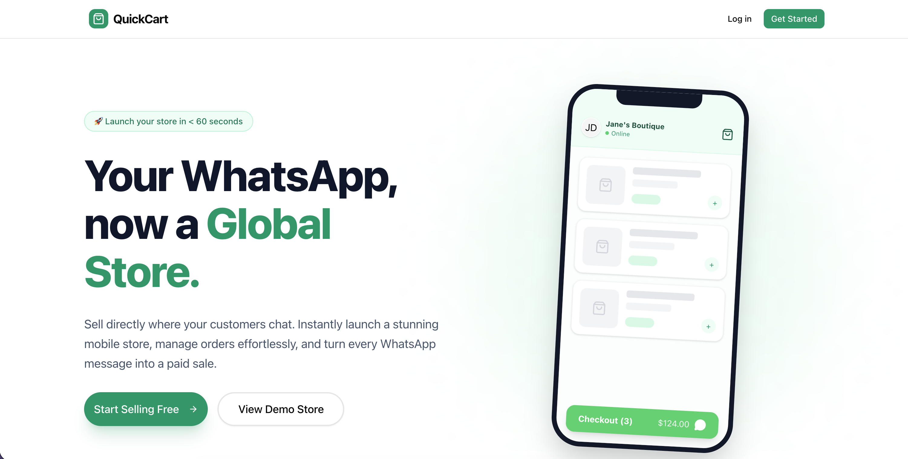 Instead of sending back-and-forth messages to explain prices and send product photos, sellers create a QuickCart Store. Customers browse, add to cart, and the final order is sent as a pre-formatted WhatsApp message to the seller to finalize payment and delivery.