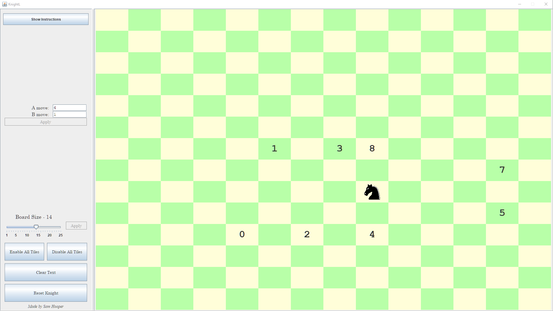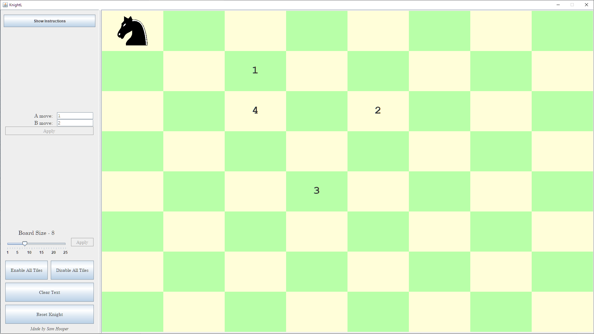 The knight will find a shortest path to any tile you click on and number the steps to get there. The knight starts in the top-left corner, but you can move him my middle-clicking a new start tile.