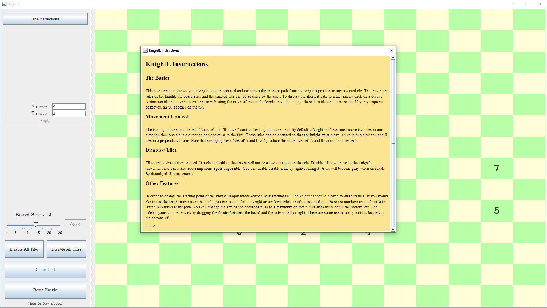 KnightL is an app that calculates the shortest path for a knight to get from one square to another on a chessboard. More detailed information and instructions can be found on the "Releases" page, but this document shows some pictures of the app.