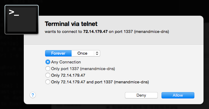 Ironically, the Little Snitch firewall conveniently allows you to use keyboard shortcuts to permanently allow outbound connections from our software! We simply send the right keystrokes (up up up left left enter), and voila. We never have to worry about it again.