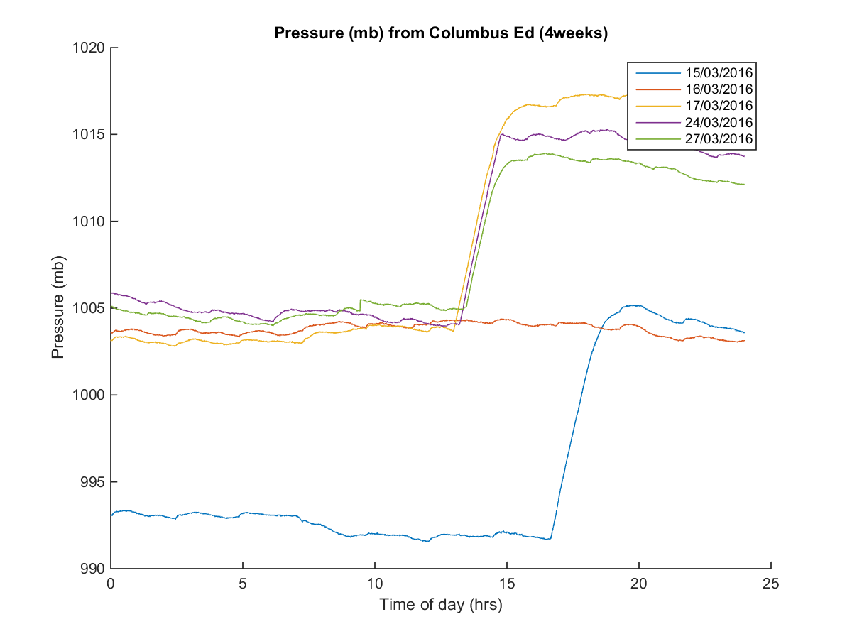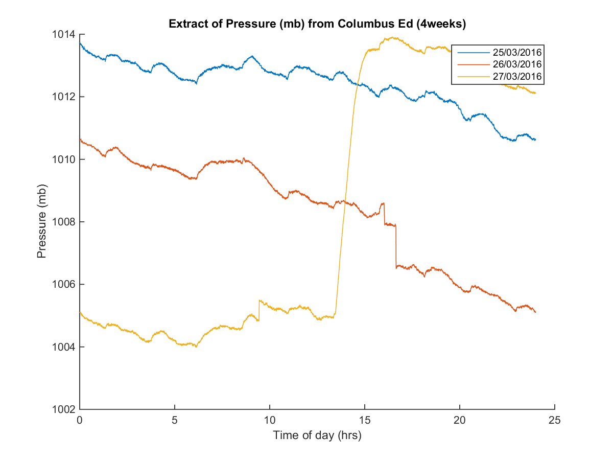 ##Results: ###Columbus It was noted that on 25/02/2016 between 1200hrs and 1500hrs there was a spike in air pressure from the normal reading of approx. 1008mb to 1022mb.