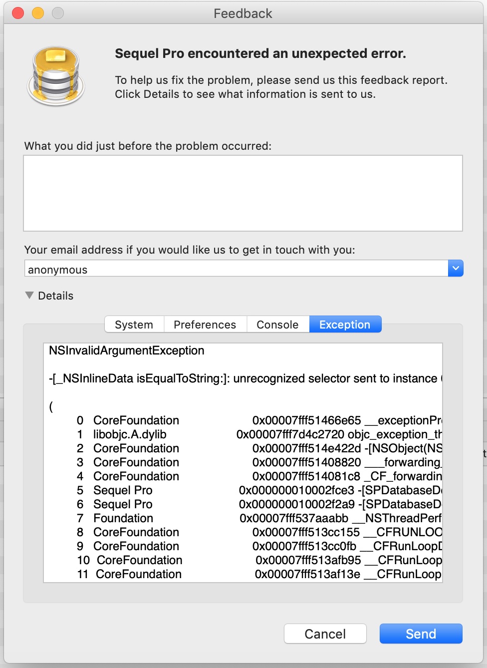 6 Sequel Pro 0x000000010002f2a9 -[SPDatabaseDocument setConnection:] + 610