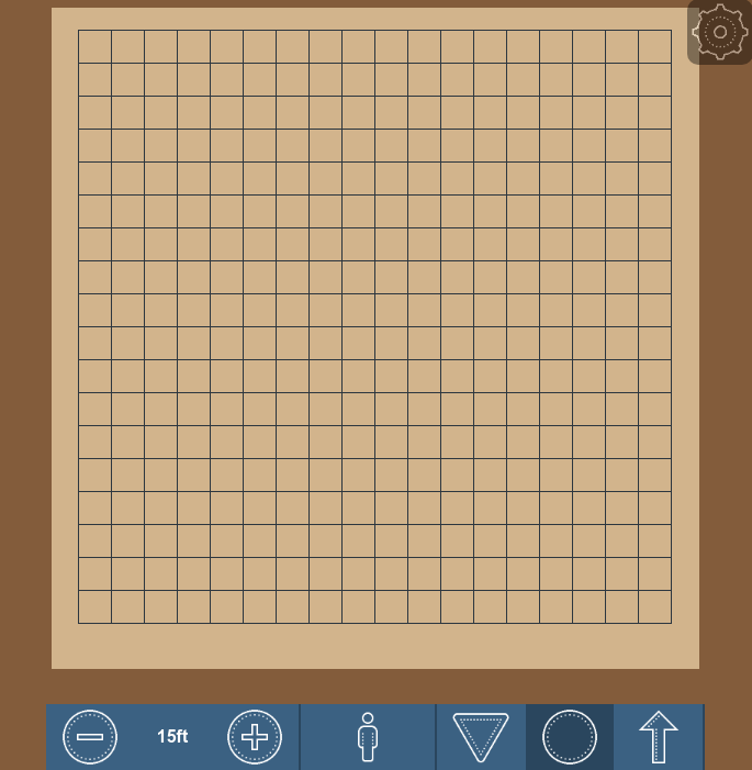 This is the basic interface to the app! The board is layed out as a familiar battlemap, with a toolbar at the bottom and a settings button near the top. This view is flexible across screens of all sizes! Let's break it down into parts.