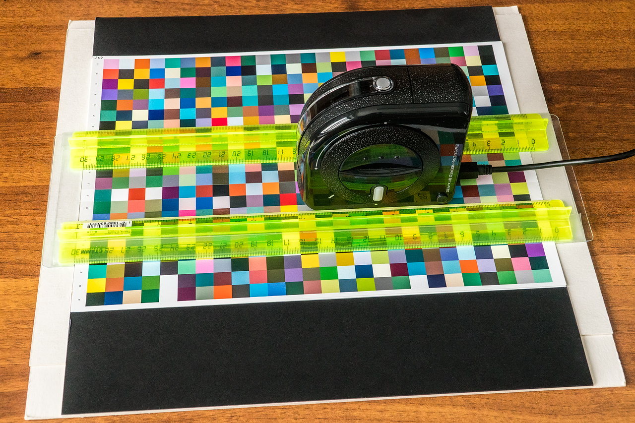 For the convenience of measuring color maps with small patches using a Colormunki Photo spectrophotometer, you can make a simple fixture of cardboard, two rulers and an office file film: