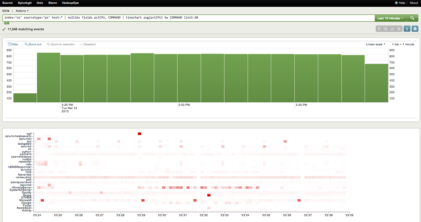 From Heatwave, you can see the distribution of measures in bucketed ranges on the y-axis, with time on the x-axis. Heatwave is vastly superior to the standard visualizations graphing derived measures avg/min/max/std, because Heatwave will show the actual spread and distribution of those measures (like a histogram) over time.