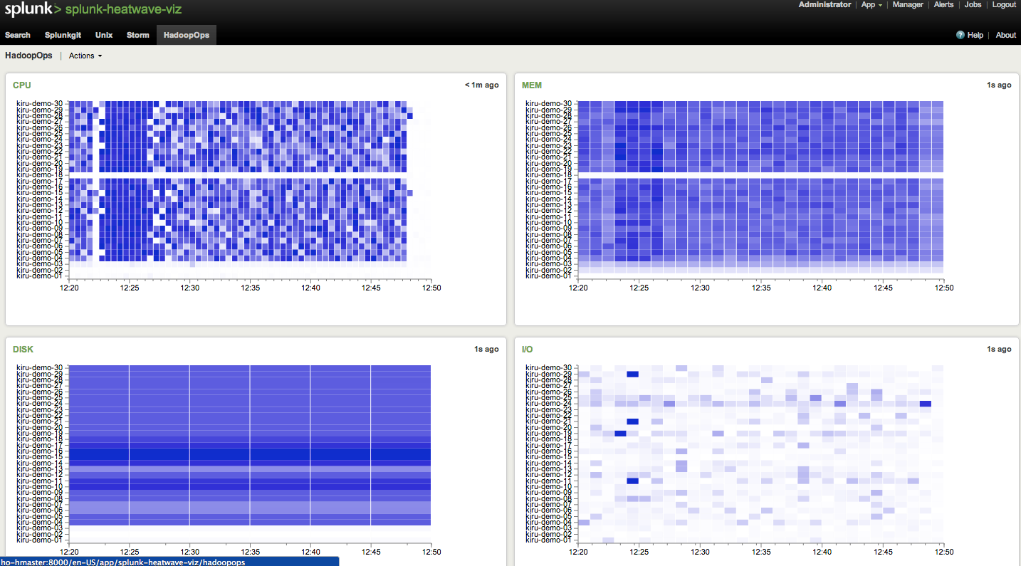 Splunk-heatwave-viz is both an app, and a module that you can integrate in your own dashboards. The app comes with a visualization module and a drill down module that enables you to specify drill down queries similar to that of splunk's own hidden search module. The module also comes with a threshold search command with which you can set an upper and lower bound for the data to be visualized. The heatwave module and the drill down module comes with a set of parameters that can be applied though the xml.