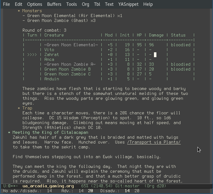 It's useful to activate the mode automatically when you open the Org-mode file in which you are keeping your campaign notes. You can also specify the names of your party members, and their initiative modifiers, if you want to use org-d20's combat tracker.