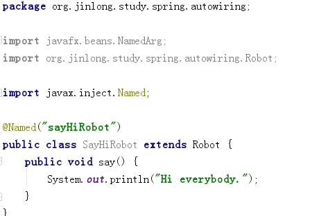 <bean id="sayHiRobot" class="org.jinlong.study.spring.autowiring.SayHiRobot"></bean>