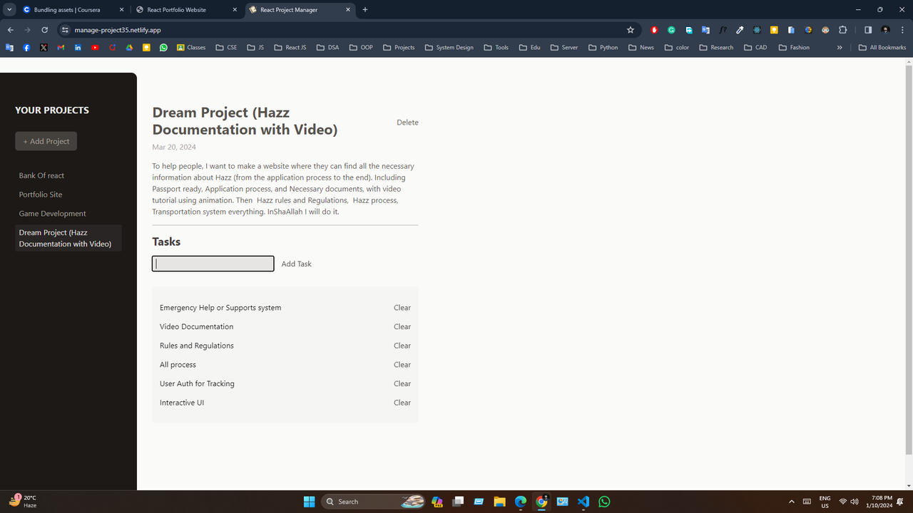 Project Management Application (web) Projects Can be managed using this web application. New projects can be added, deleted, or edited. Add under the project tasks can be add Screenshot Live Demo: https://manage-project35.netlify.app/ Technology React js