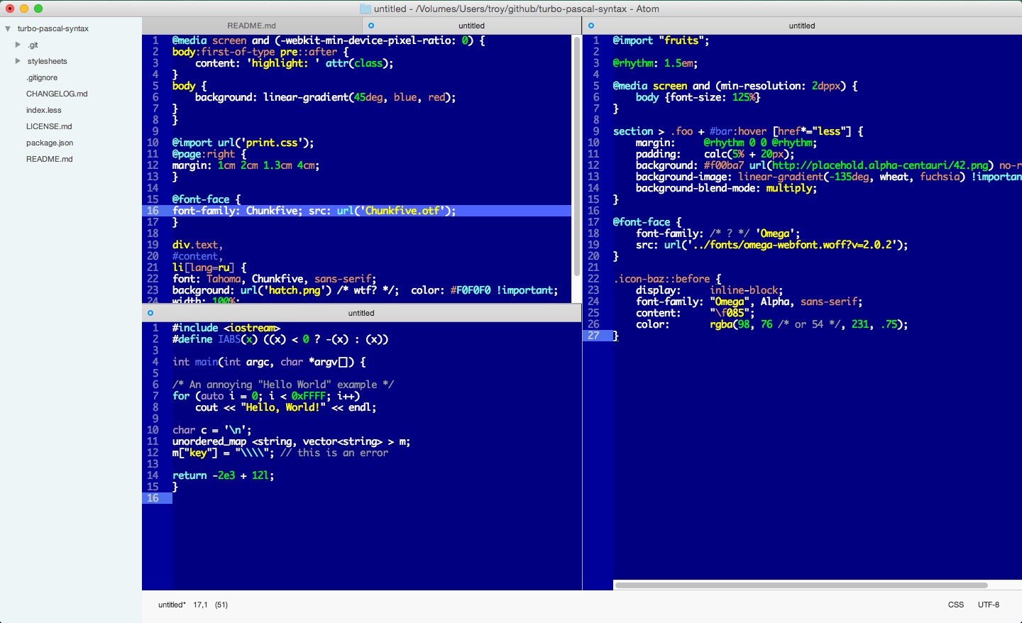 turbo-pascal-syntax theme A syntax theme reminiscent of the Borland Turbo Pascal IDE. Feel free to send pull requests for corrections or alterations.
