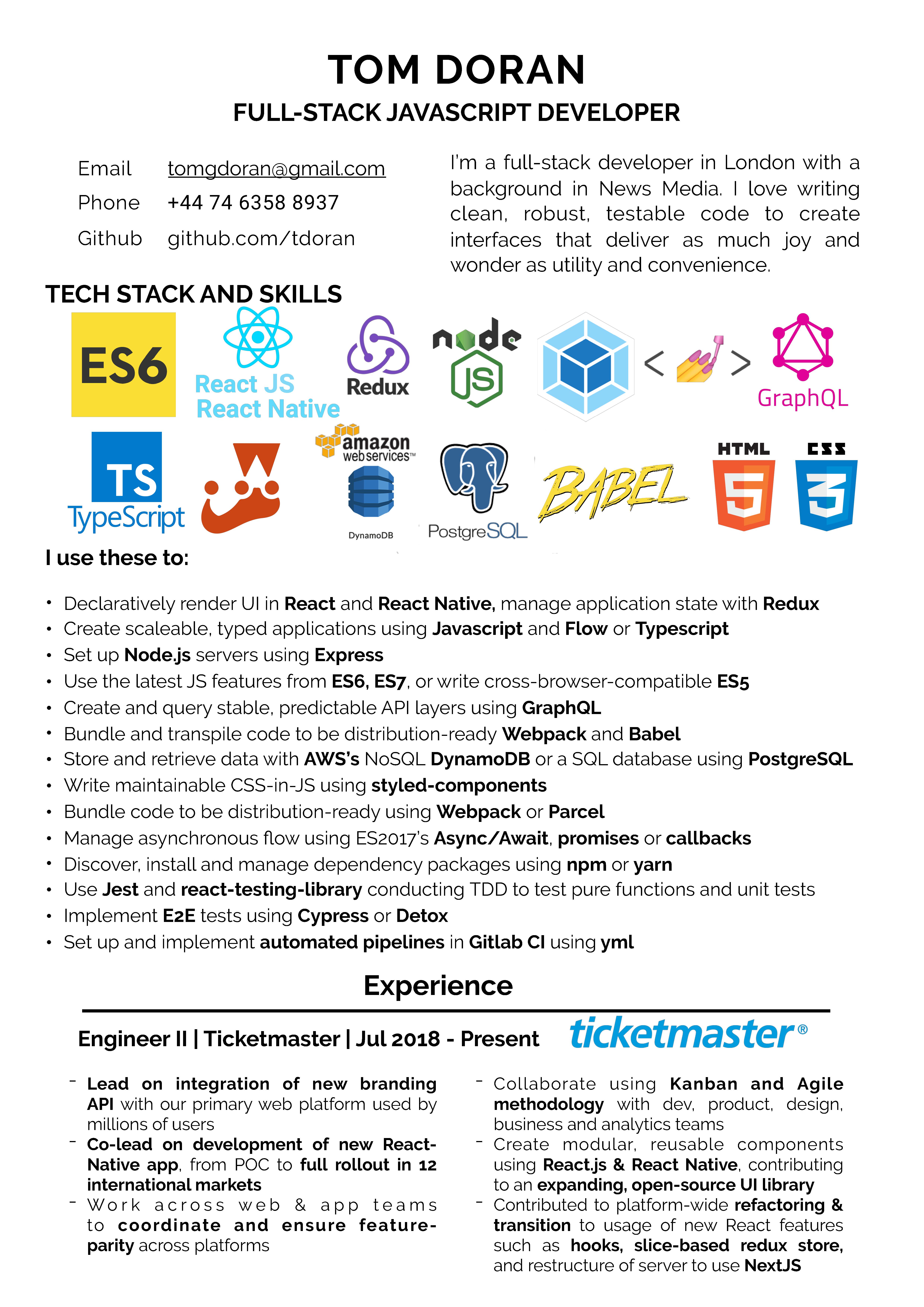 I'm a full-stack developer in London with a background in News Media. I love writing clean, robust, testable code to create people-centred interfaces that deliver as much joy and wonder as utility and convenience.