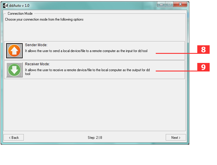 9- Receiver Mode: allows the user to accept the output of dd from a remote sender over TCP connection.