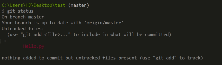 然後使用 git status 觀看目前的 repository ( repo 容器 ),你會看到 Hello.py 未被追蹤,如下圖