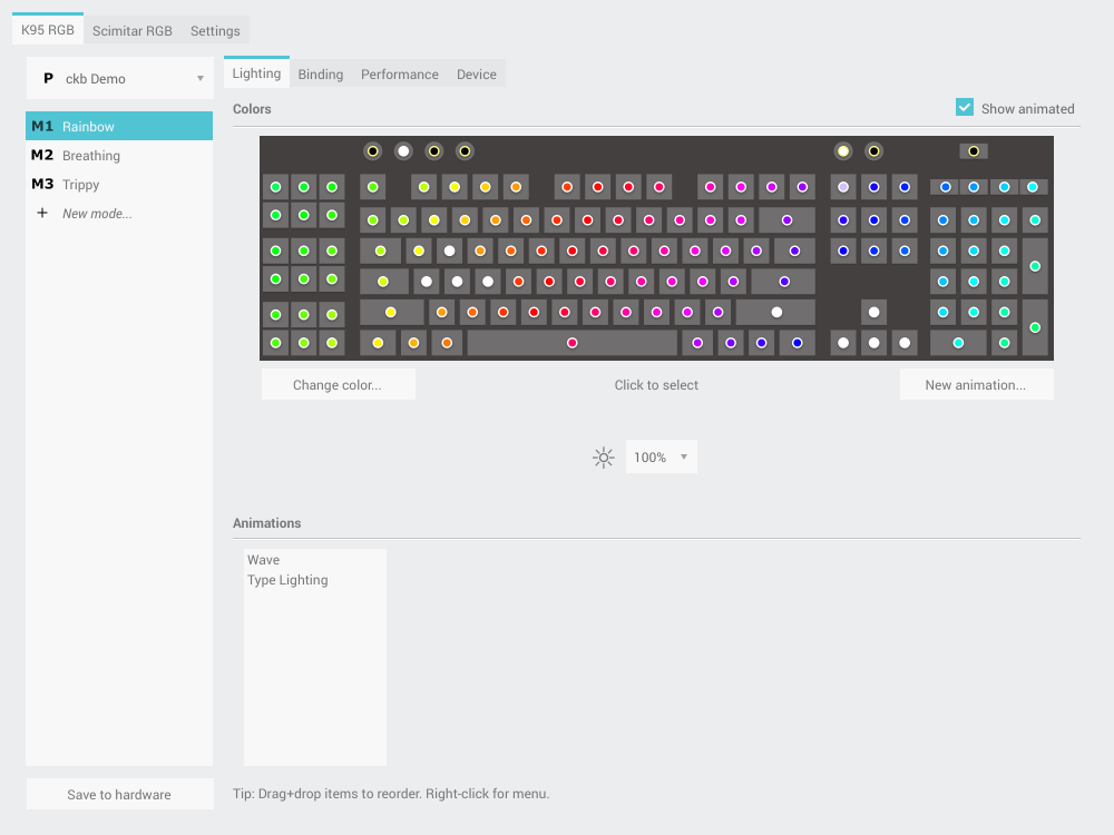 ckb is an open-source driver for Corsair keyboards and mice. It aims to bring the features of their proprietary CUE software to the Linux and Mac operating systems. This project is currently a work in progress, but it already supports much of the same functionality, including full RGB animations. More features are coming soon. Testing and bug reports are appreciated!