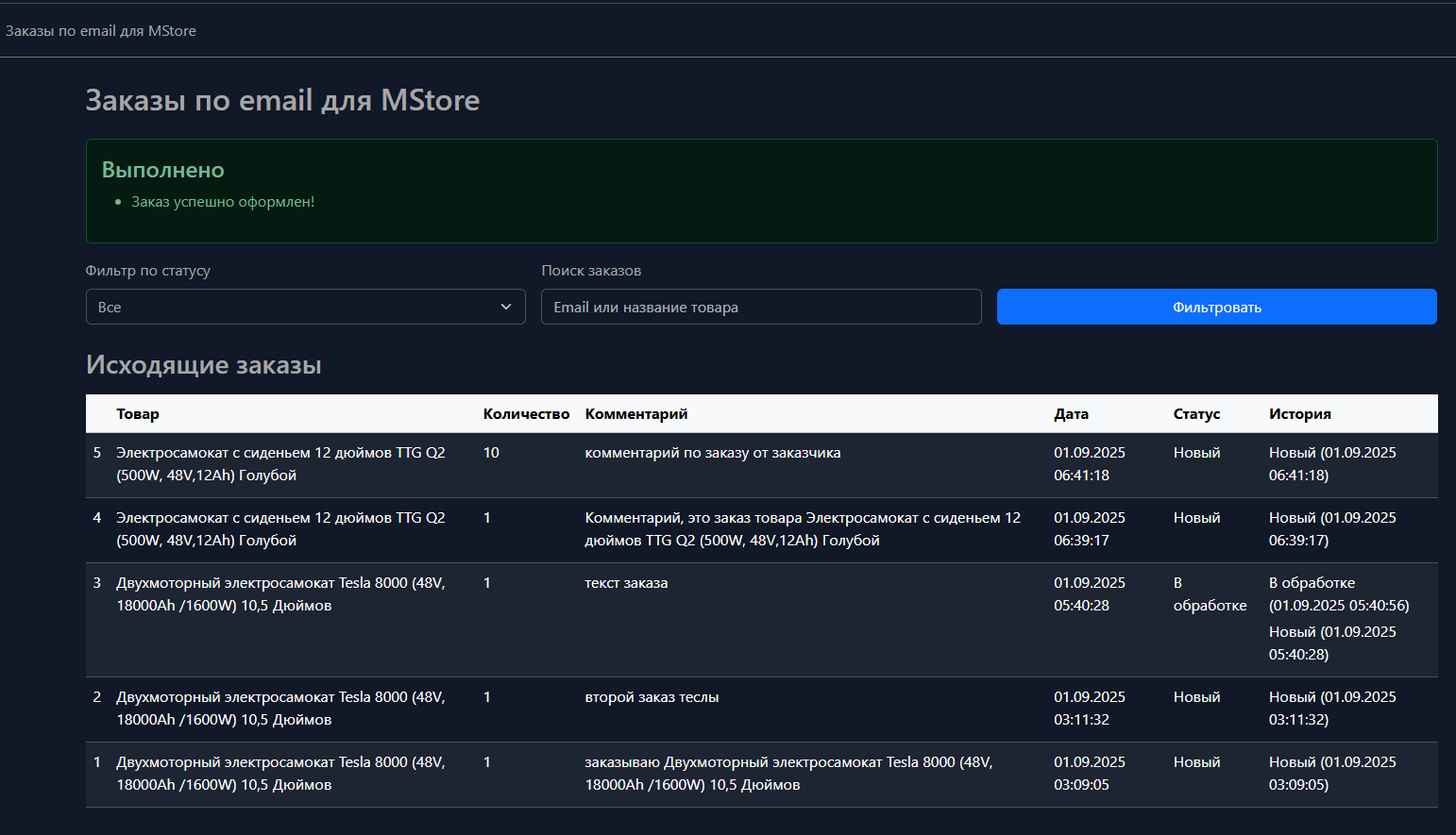 mstoremailorder.tpl) по?item_id=ID. Валидирует данные, сохраняет заказ в БД, отправляет email. - Исходящие заказы (