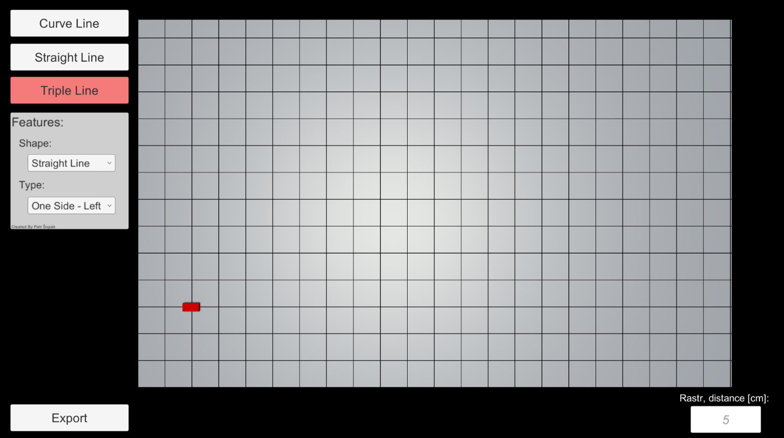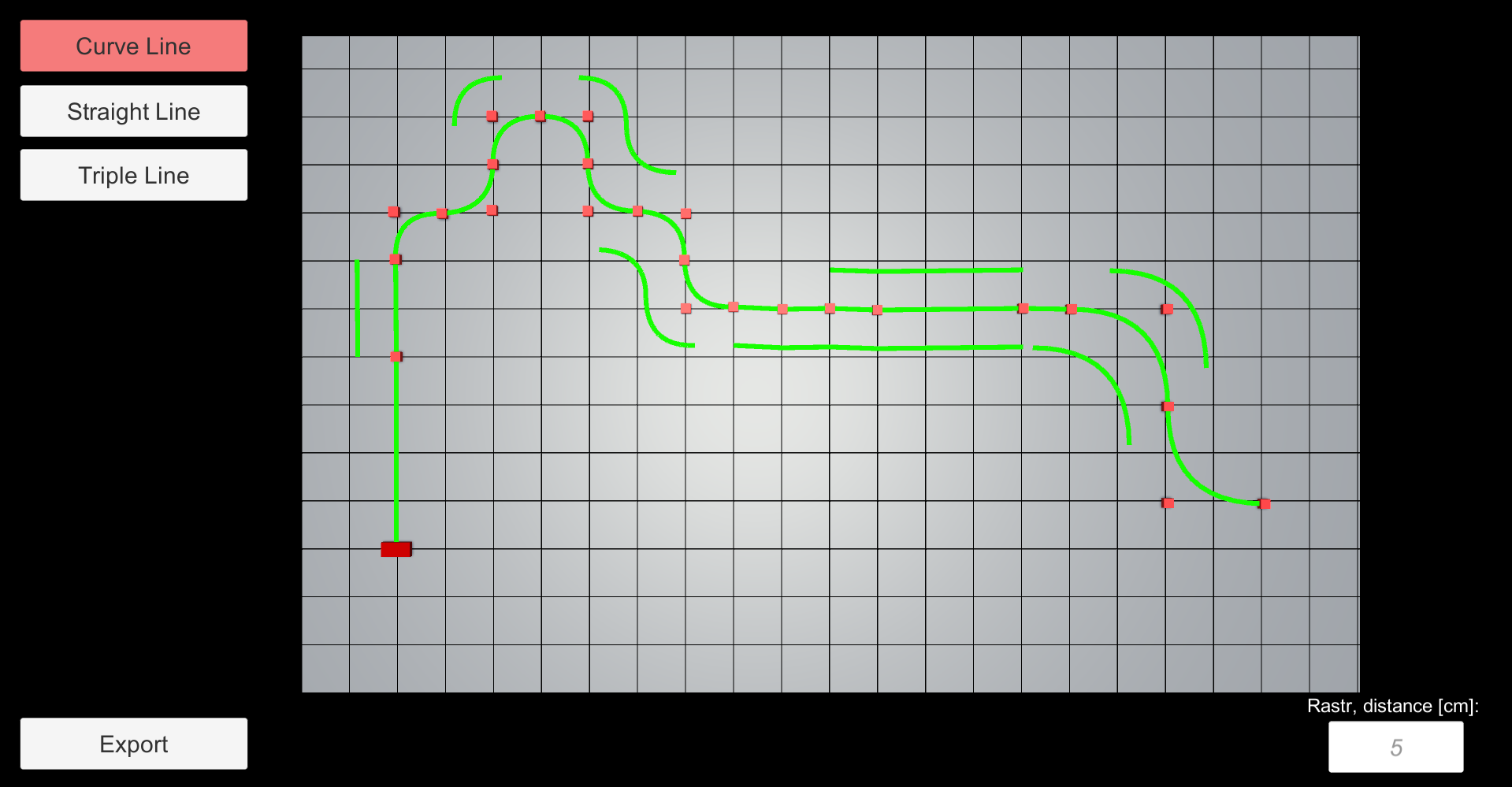 Jak jde vidět na obrázku (obr.2.), úsečky nejsou problém zrealizovat, ale pro oblouky by uživatel musel naklikávat n počet bodů, proto byla použita Bezierova křivka. Je potřeba naklikat tři body - počáteční, střední a koncový bod, kde střední bod určuje zakřivení oblouku a není dále součástí exportovaných bodů. Díky této křivce jsou získány body vzdálené o parametr r = 0,1 (lze ji změnit v programu) mezi počátečním a koncovým bodem.
