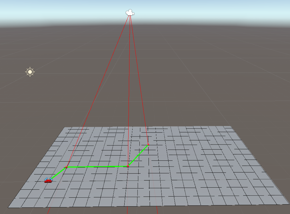 Hlavní trasa má vždy počátek v bodě [0,0,0] (dle pravidel soutěže) a následně jsou k nim přídány kolizní body. Počáteční a naklikané body jsou vizuálně vyznačeny primitivním objektem krychle (Cube). Body jsou pospojeny pomocí jedné čáry pomocí LineRenderer komponentu přidané pevně na Empty Object. LineRenderer zajišťuje vytváření komplexních čar pomocí zadáním počtu a pozice bodů. Vizualizace čar lze vidět na obázku (obr.3.)