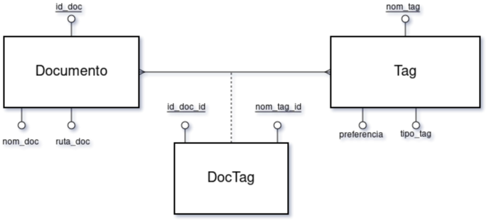 La entidad DocTag representa en duplas la asociación de un Documento a un Tag y viceversa, añade también un nuevo atributo: comprobado.