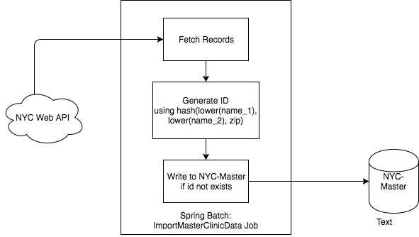 - After running the application, the loadMasterdata job will load the data from the JSON api and add it to the NYC_MASTER_CLINIC_DATA table in the master_data database.