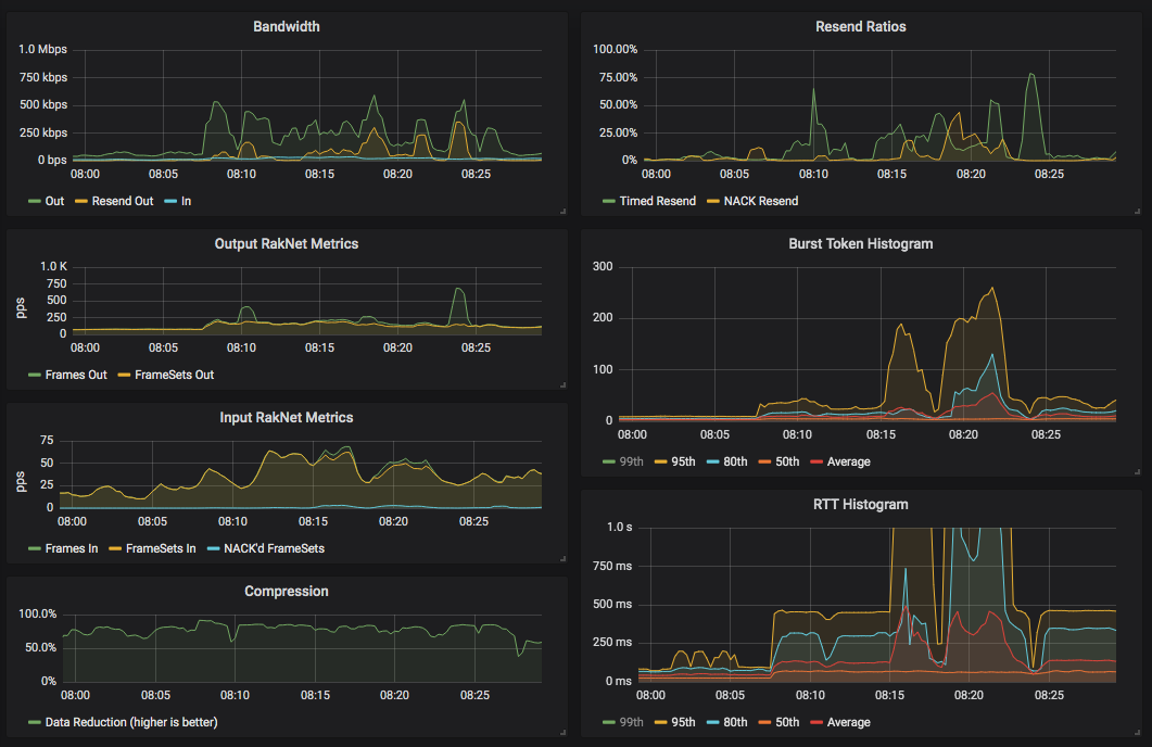Generate user RakNet metrics using Prometheus. Grafana (example panel here) can be used to display awesome graphs like this: