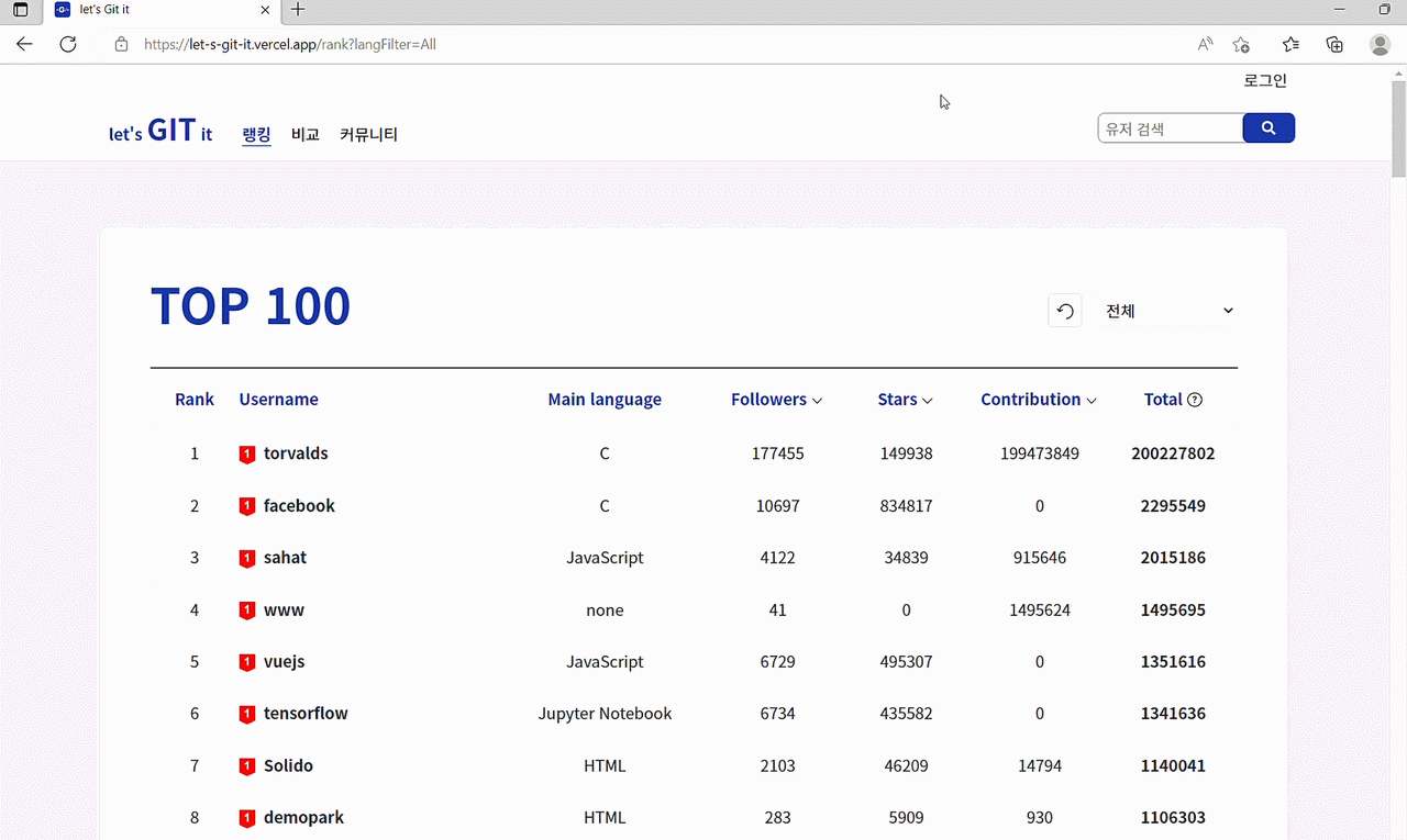 - 호기심(10%), 열정(20%), 명성(35%), 능력(35%)로 산출된 종합 점수를 토대로 나타낸 github 랭킹 시스템